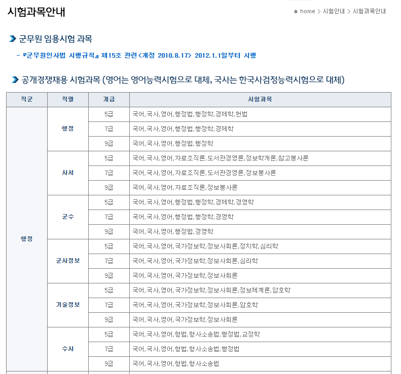 5급: 국어, 국사, 영어, 행정법, 행정학, 경제학, 헌법