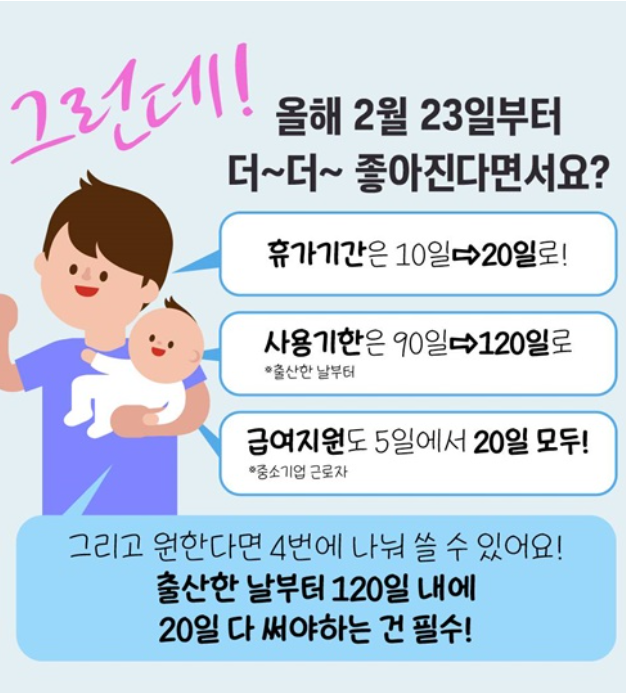 이제는 마음 놓고 총 20일을, 출산일로부터 120일 이내라면 최대 4번까지 나누어 사용할 수 있게 된 것입니다.