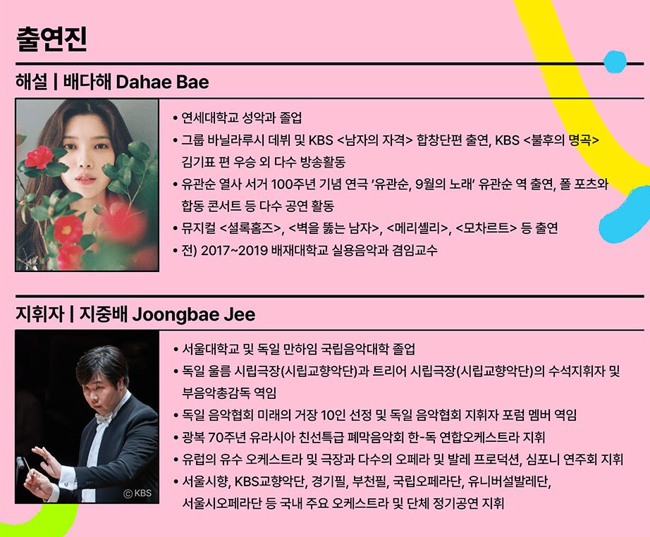 아름답고 따뜻한 음색으로 사랑받는 배다해 님은 성악을 전공한 해설자이자 아티스트로, 음악적 배경과 감성적인 스토리텔링을 통해 관객 여러분이 클래식을 더 친근하게 느낄 수 있도록 도와드립니다.