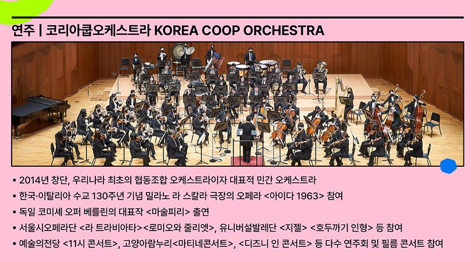 연주를 맡은 코리아쿱오케스트라는 국내 대표 민간 오케스트라로, 깊이 있고 안정적인 연주력을 자랑합니다. 함께하는 노이오페라코러스는 풍부한 경험과 탄탄한 구성력을 바탕으로 웅장한 합창을 구현합니다.
