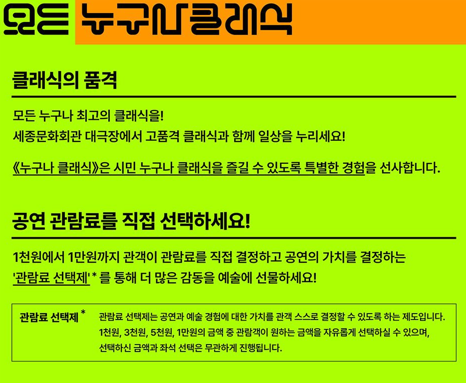 공연 예매 및 자세한 정보는 세종문화회관 공식 누리집 ‘누구나 클래식’ 페이지에서 확인하실 수 있습니다.